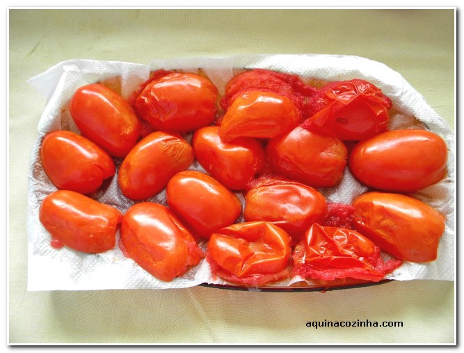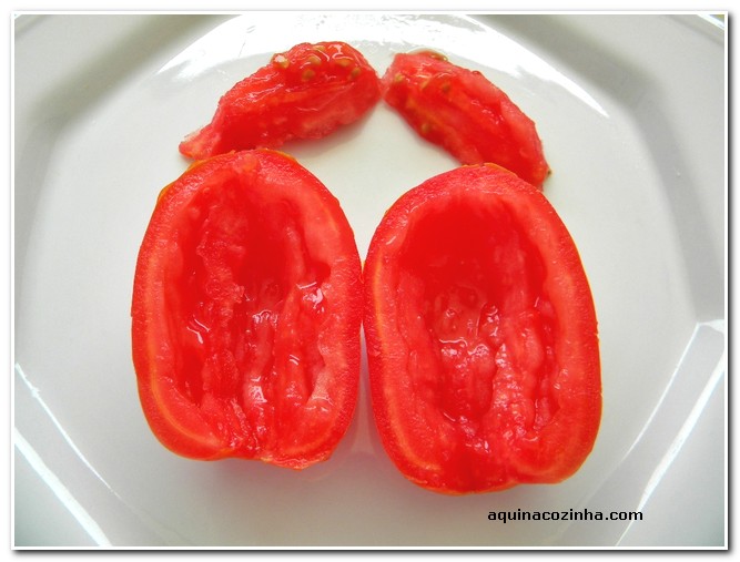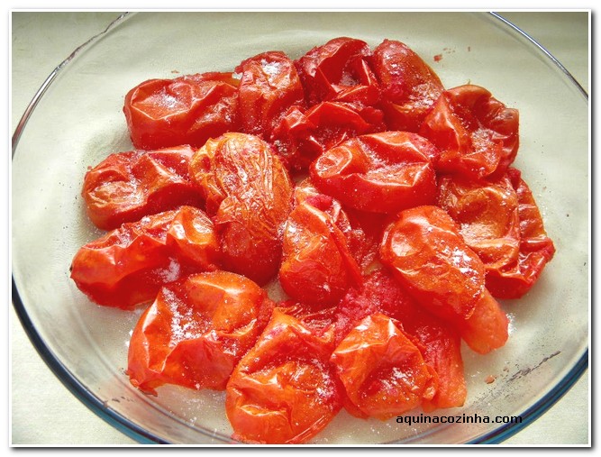 Lave e corte os tomates na metade, no sentido do comprimento. Com a ajuda de uma faca ou de uma colher, retire as sementes e a polpa do tomate (como na Foto 3). Reserve a polpa com as semente para fazer outra receita, depois eu digo o que fiz com a minha. Cubra um recipiente (que possa ir no micro-ondas) com papel toalha. Arrume, sobre o papel toalha as metades dos tomates, com as cascas viradas para cima. Leve ao micro-ondas por cinco minutos. Quando este tempo acabar, retire os tomates com uma colher (com muita delicadeza para não esbagaçar), retire o papel, enxugue e coloque um novo papel. Arrume novamente as metades dos tomates e leve ao micro-ondas por mais cinco minutos. Retire e arrume-os em uma forma polvilhada com 1 colher (de chá de sal) e 1 colher (de chá) de açúcar. Arrume os tomates sobre essa mistura. Polvilhe mais 1 colher (de chá de sal) e 1 colher (de chá) de açúcar por cima dos tomates e leve ao forno médio por 15 a 20 minutos ou até os tomates começarem a dourar.