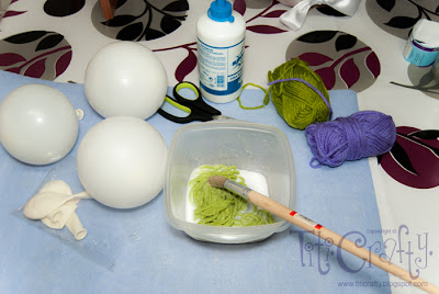 Cola branca, água, balões de borracha, lã, tesoura, pincel e pote plástico.