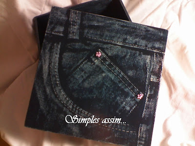 Com a tampa ainda úmida, pegue a peça jeans que você escolheu e "carimbe" o lado do jeans da sua preferência, apertando com a mão... Retire (No sentido "pra cima") com cuidado pra que o jeans não corra para os lados borrando a caixa.