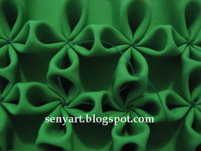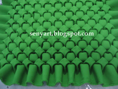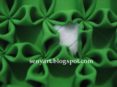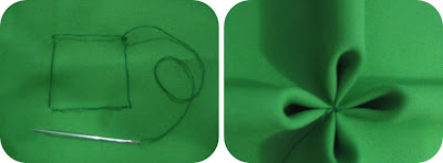 Risque o tecido no avesso, conforme o gráfico, faça o fuxico invertido em todo o tecido na marcação do x