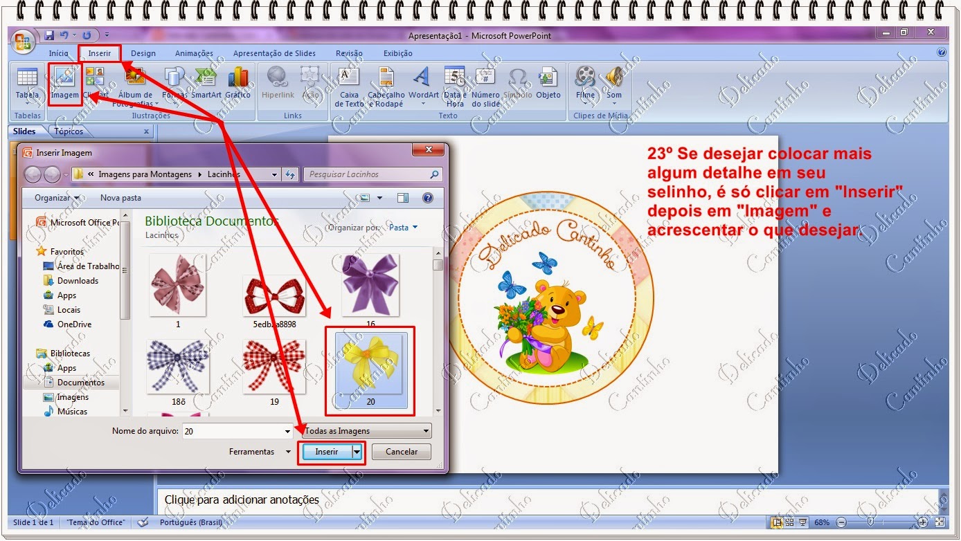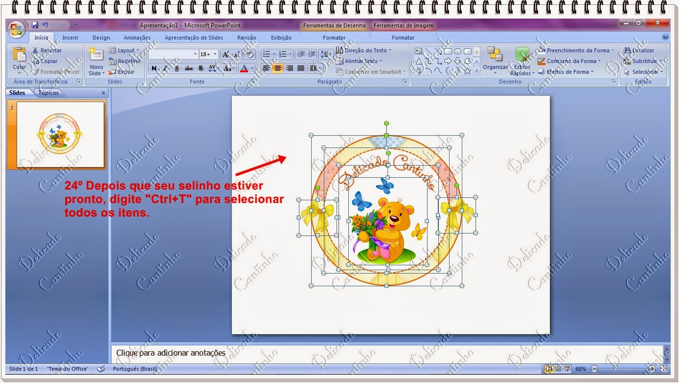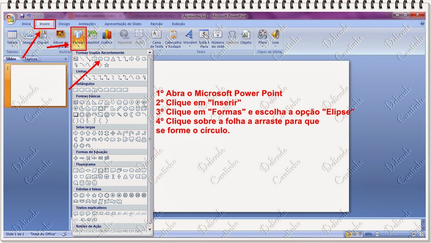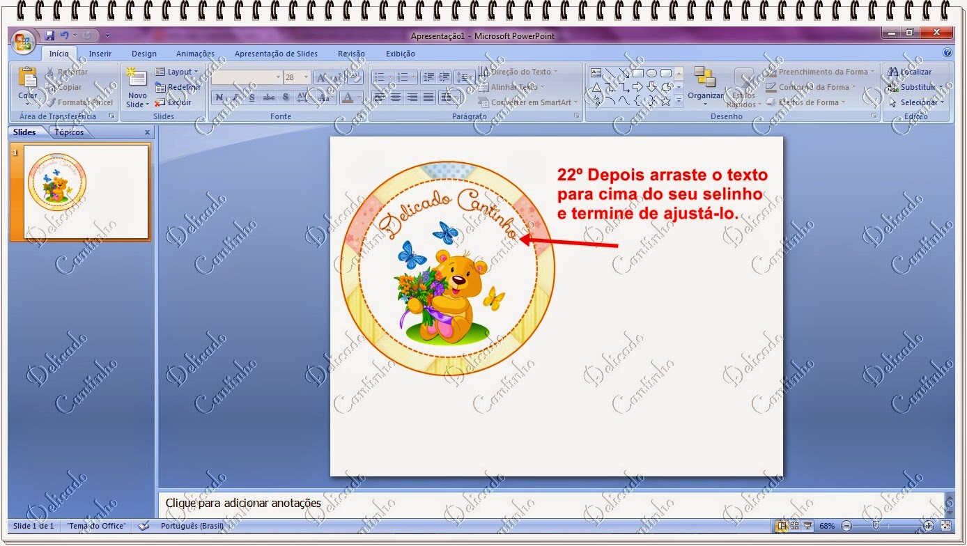 Hoje trago para vocês um passo a passo de como fazer selinhos no PowerPoint. Como já aconteceu com várias amigas inclusive comigo de outras pessoas copiarem nossas fotos e divulgarem como se os trabalhos fossem delas é sempre bom identificarmos nossos trabalhos seja com marquinha d'agua que inclusive já fiz uma postagem, que explica em detalhes como fazer. Caso você não tenha visto a postagem clique Aqui ou com os selinhos. Sei que isso não impede que as más intencionadas usem nossas fotos como se fossem delas, mas dificulta bastante. (TODOS OS CRÉDITOS SÃO DO DELICADO CANTINHO)