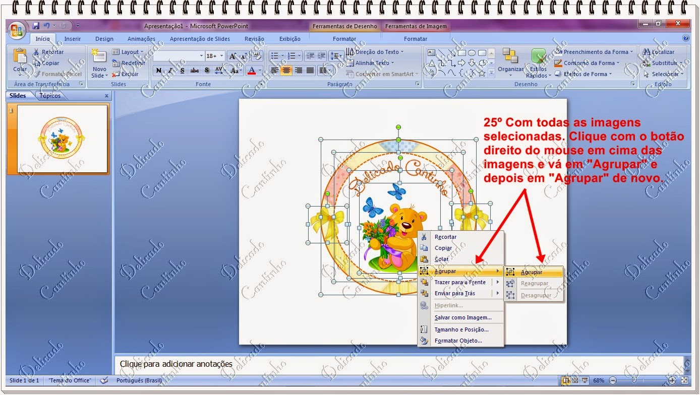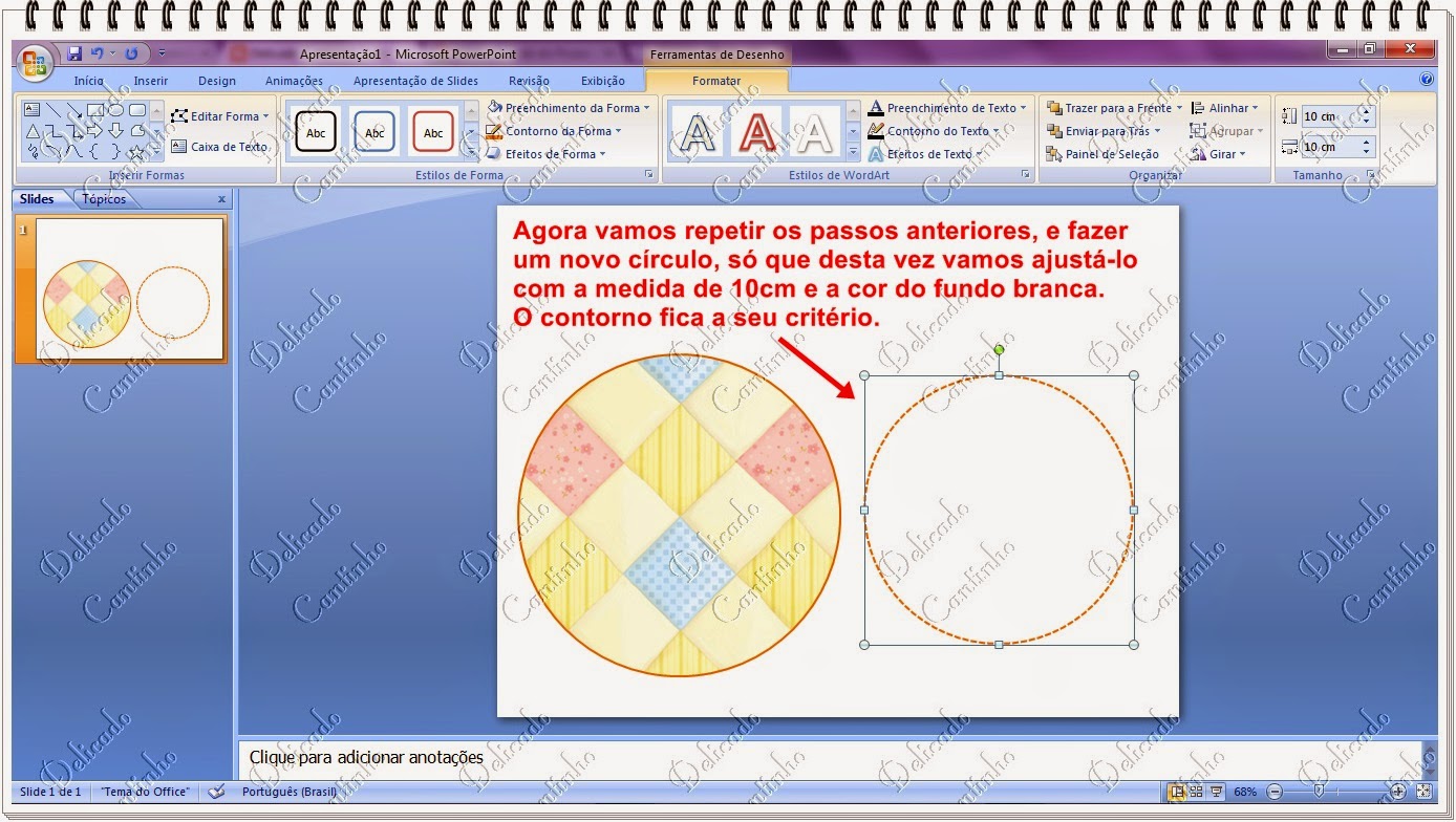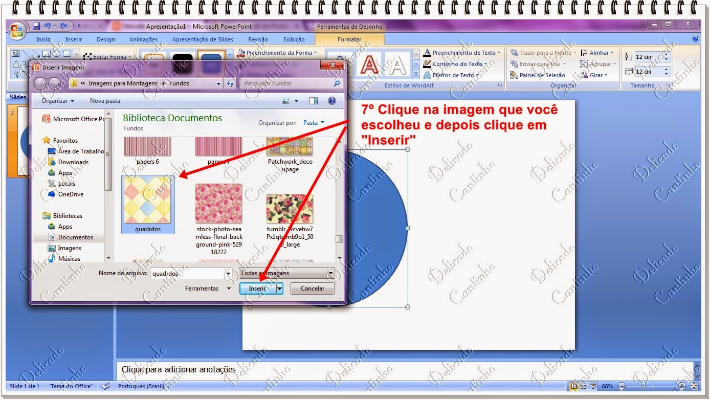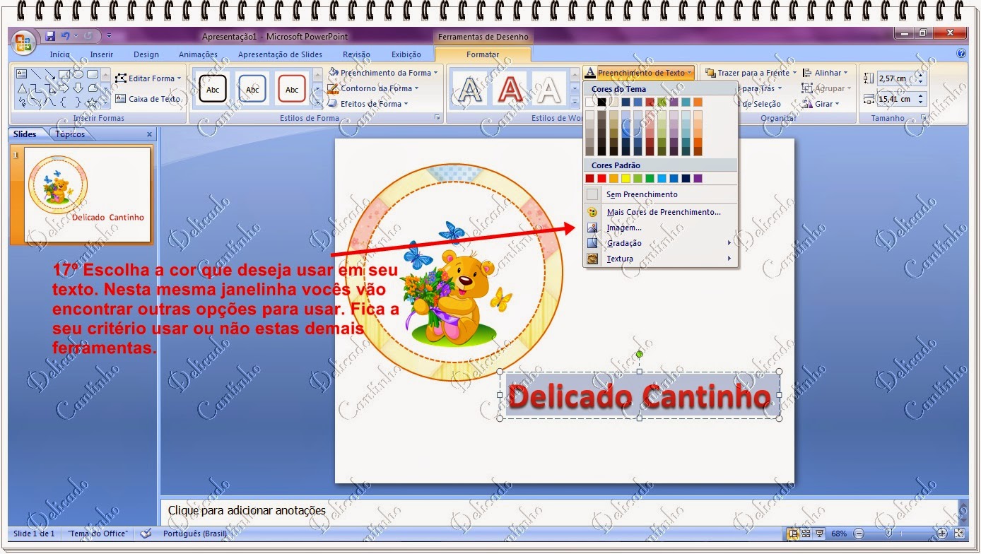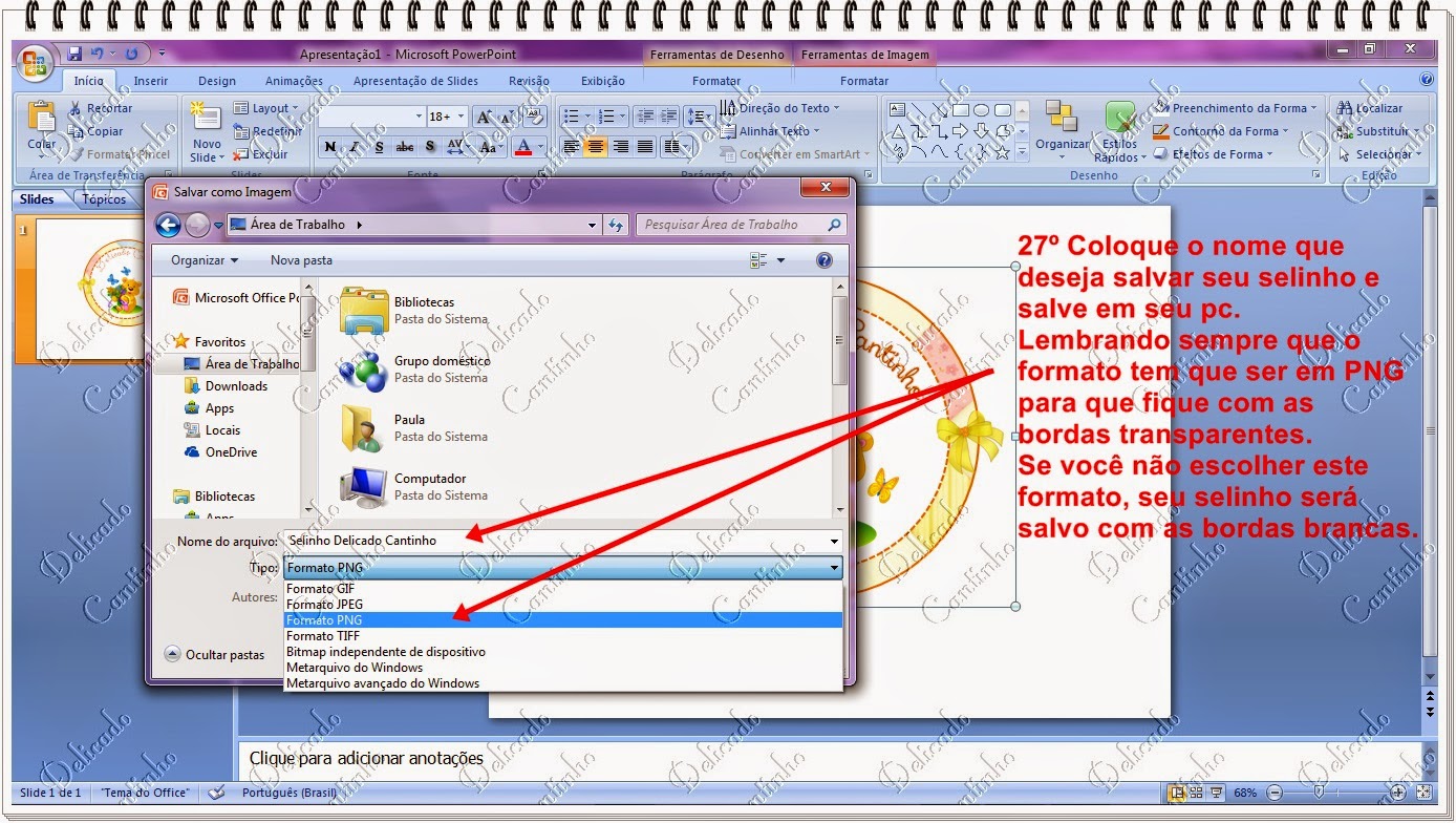 Hoje trago para vocês um passo a passo de como fazer selinhos no PowerPoint. Como já aconteceu com várias amigas inclusive comigo de outras pessoas copiarem nossas fotos e divulgarem como se os trabalhos fossem delas é sempre bom identificarmos nossos trabalhos seja com marquinha d'agua que inclusive já fiz uma postagem, que explica em detalhes como fazer. Caso você não tenha visto a postagem clique Aqui ou com os selinhos. Sei que isso não impede que as más intencionadas usem nossas fotos como se fossem delas, mas dificulta bastante. (TODOS OS CRÉDITOS SÃO DO DELICADO CANTINHO)