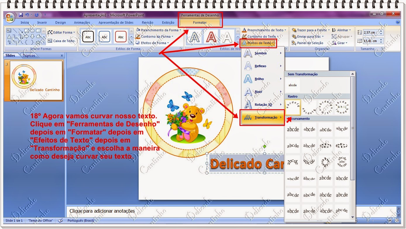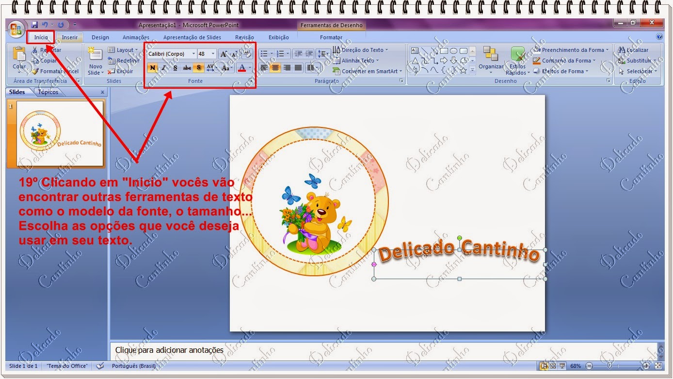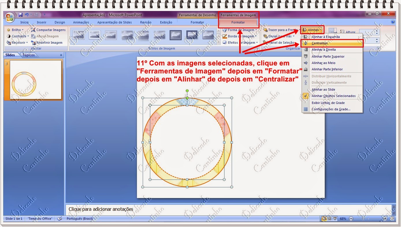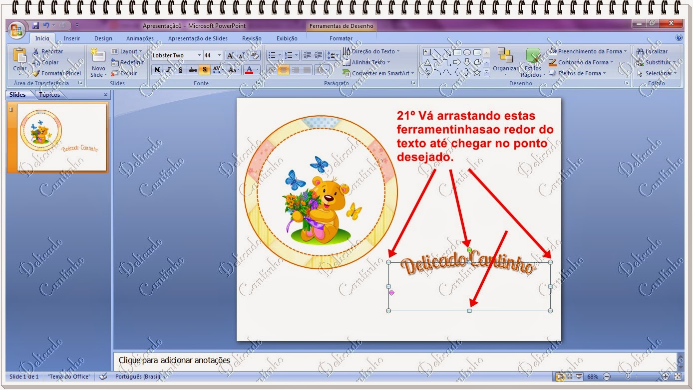 Hoje trago para vocês um passo a passo de como fazer selinhos no PowerPoint. Como já aconteceu com várias amigas inclusive comigo de outras pessoas copiarem nossas fotos e divulgarem como se os trabalhos fossem delas é sempre bom identificarmos nossos trabalhos seja com marquinha d'agua que inclusive já fiz uma postagem, que explica em detalhes como fazer. Caso você não tenha visto a postagem clique Aqui ou com os selinhos. Sei que isso não impede que as más intencionadas usem nossas fotos como se fossem delas, mas dificulta bastante. (TODOS OS CRÉDITOS SÃO DO DELICADO CANTINHO)