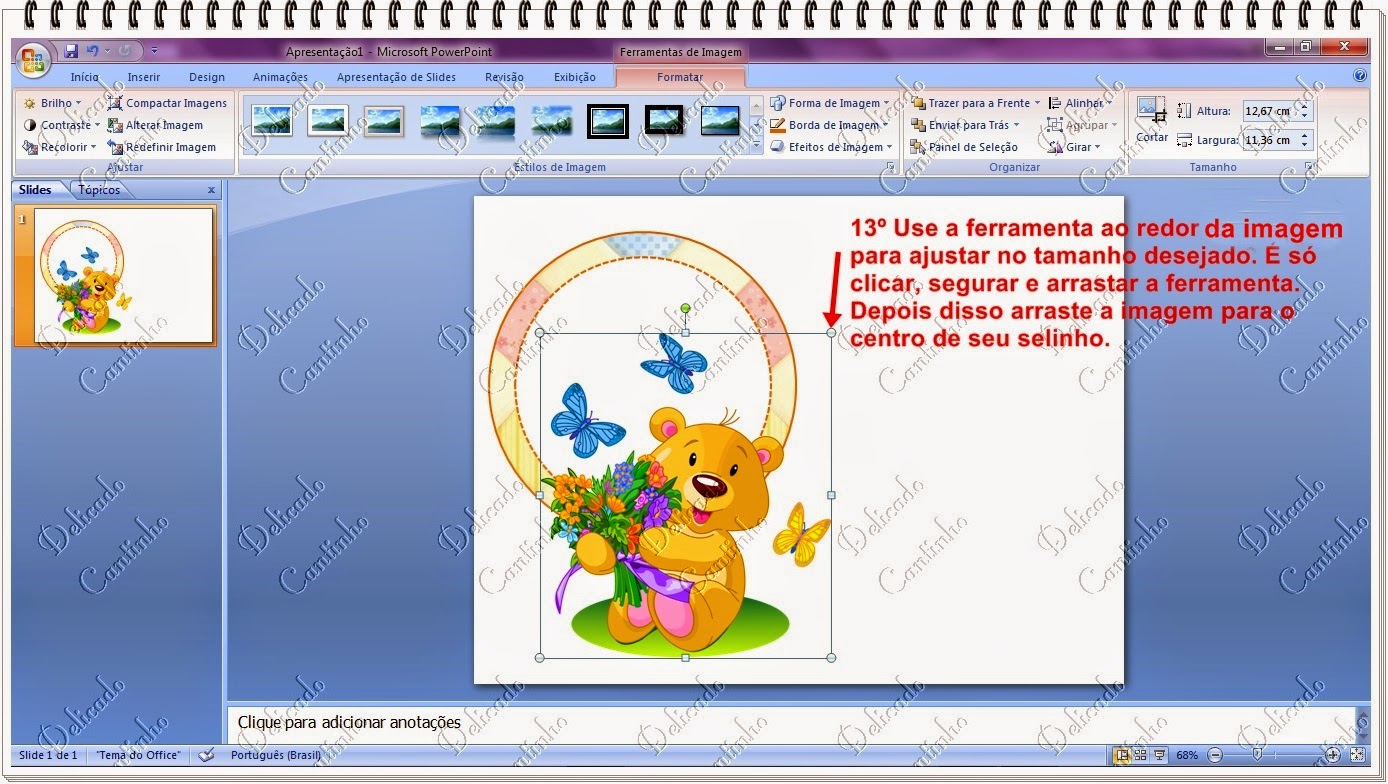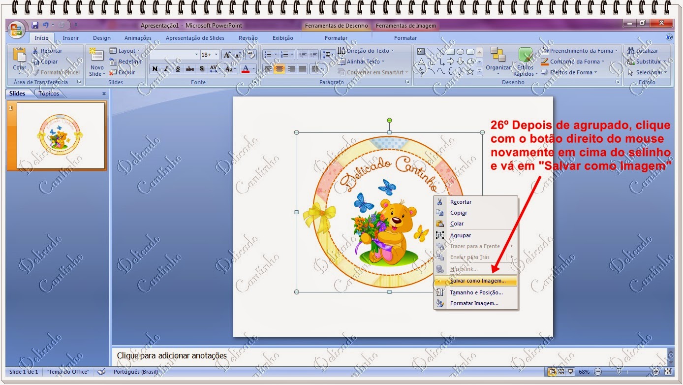 Hoje trago para vocês um passo a passo de como fazer selinhos no PowerPoint. Como já aconteceu com várias amigas inclusive comigo de outras pessoas copiarem nossas fotos e divulgarem como se os trabalhos fossem delas é sempre bom identificarmos nossos trabalhos seja com marquinha d'agua que inclusive já fiz uma postagem, que explica em detalhes como fazer. Caso você não tenha visto a postagem clique Aqui ou com os selinhos. Sei que isso não impede que as más intencionadas usem nossas fotos como se fossem delas, mas dificulta bastante. (TODOS OS CRÉDITOS SÃO DO DELICADO CANTINHO)