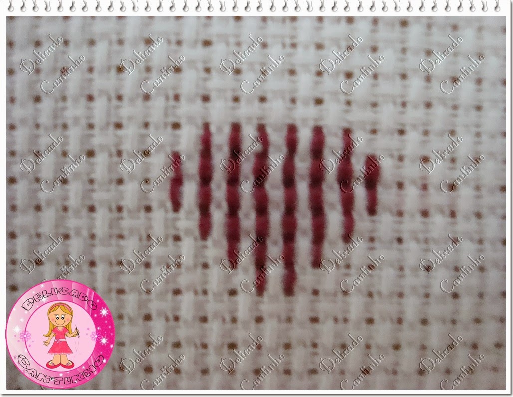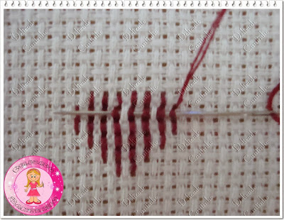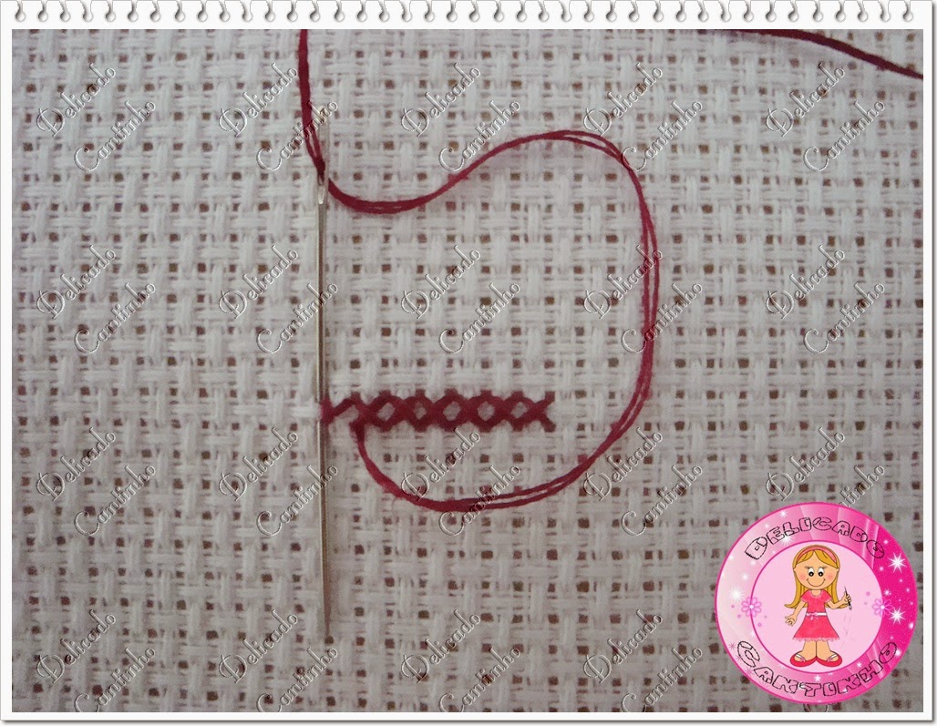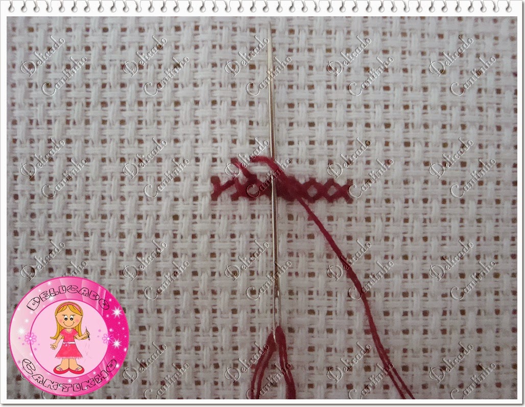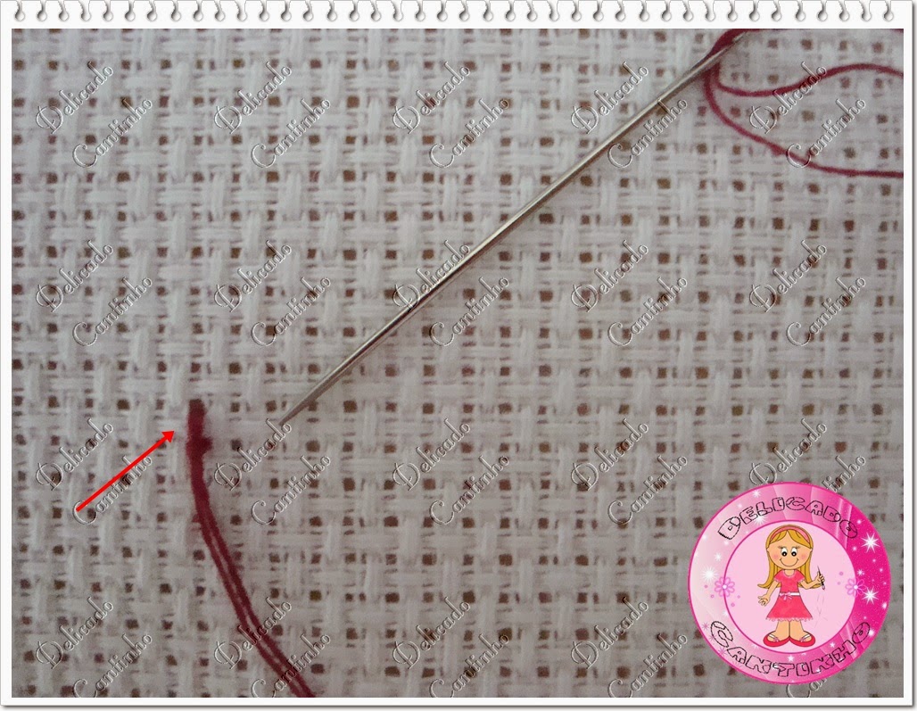 Muitas pessoas fazem assim como mostra a primeira imagem, pelo avesso do bordado. Mas eu faço como mostra a segunda imagem, pelo lado direito do bordado, pois acho que assim fica um acabamento melhor e o avesso fica mais bonito. Mas quando você vai bordar em etamine e não direto na toalha você pode fazer pelo avesso mesmo pois vai ser costurado.