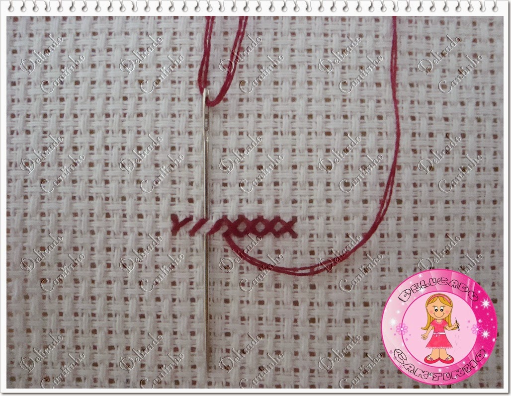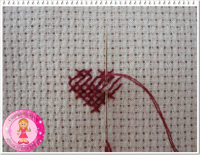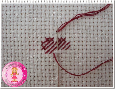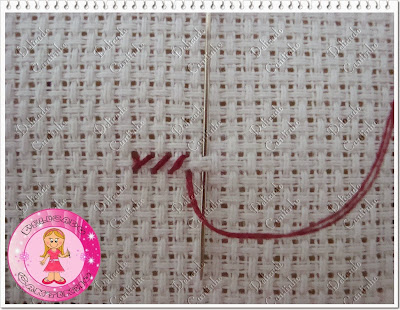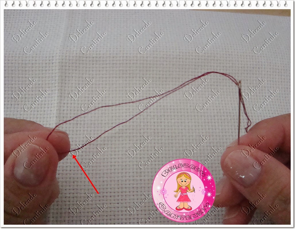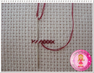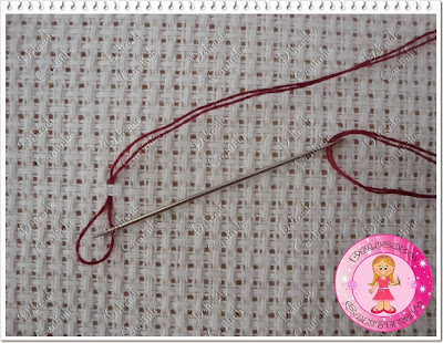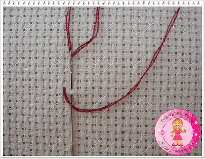 O ponto cruz geralmente é bordado com dois fios, algumas pessoas quando bordam em etamine mini (etamine com quadradinho bem pequeno) usam um fio só, mas eu prefiro usar dois mesmo quando uso o etamine mini. Corte um pedaço de linha (na cor que estará pedindo na legenda de seu gráfico) dobre e enfie as 2 pontas da linha na agulha formando uma argolinha na outra ponta.