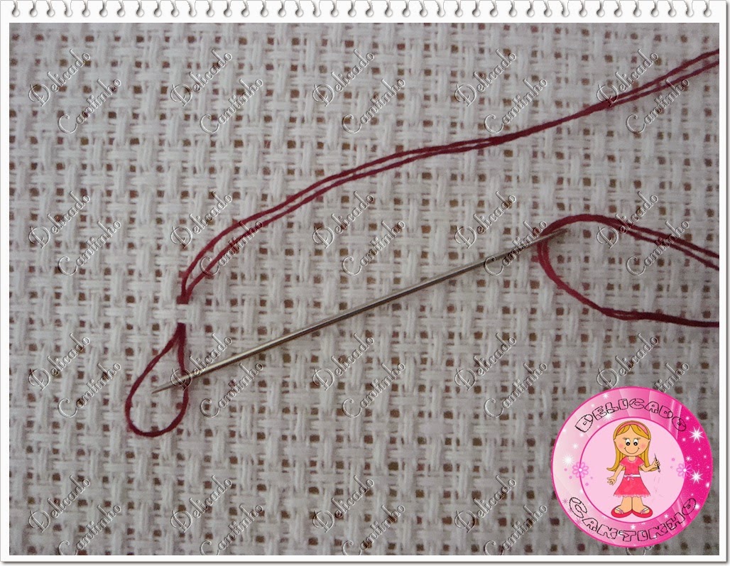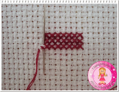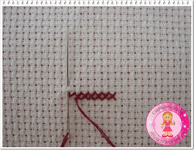 Localize na toalha o ponto por onde você vai começar a bordar, passe a agulha pelo quadradinho e depois passe a agulha pela argolinha e puxe para firmar a linha (existem outras maneiras de firmar a linha, eu prefiro assim que fica com um acabamento melhor)