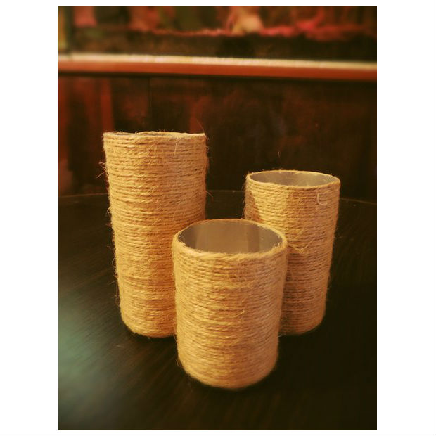Selecione algumas latinhas de alumínio e forre-as com corda fina de sisal.