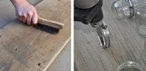 fure a madeira e também os suportes de metal. Fixe o suporte de metal